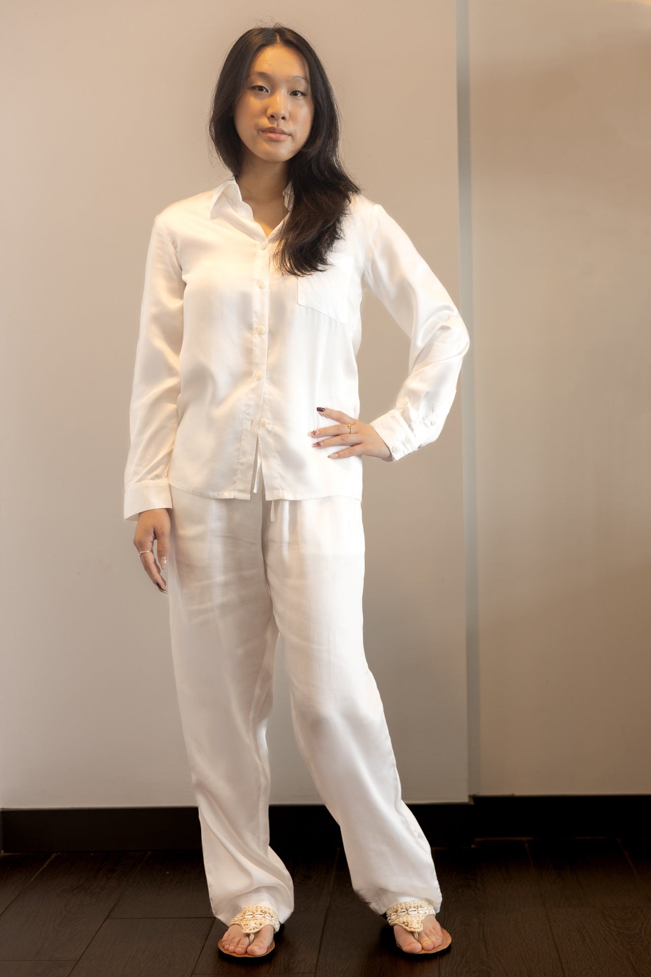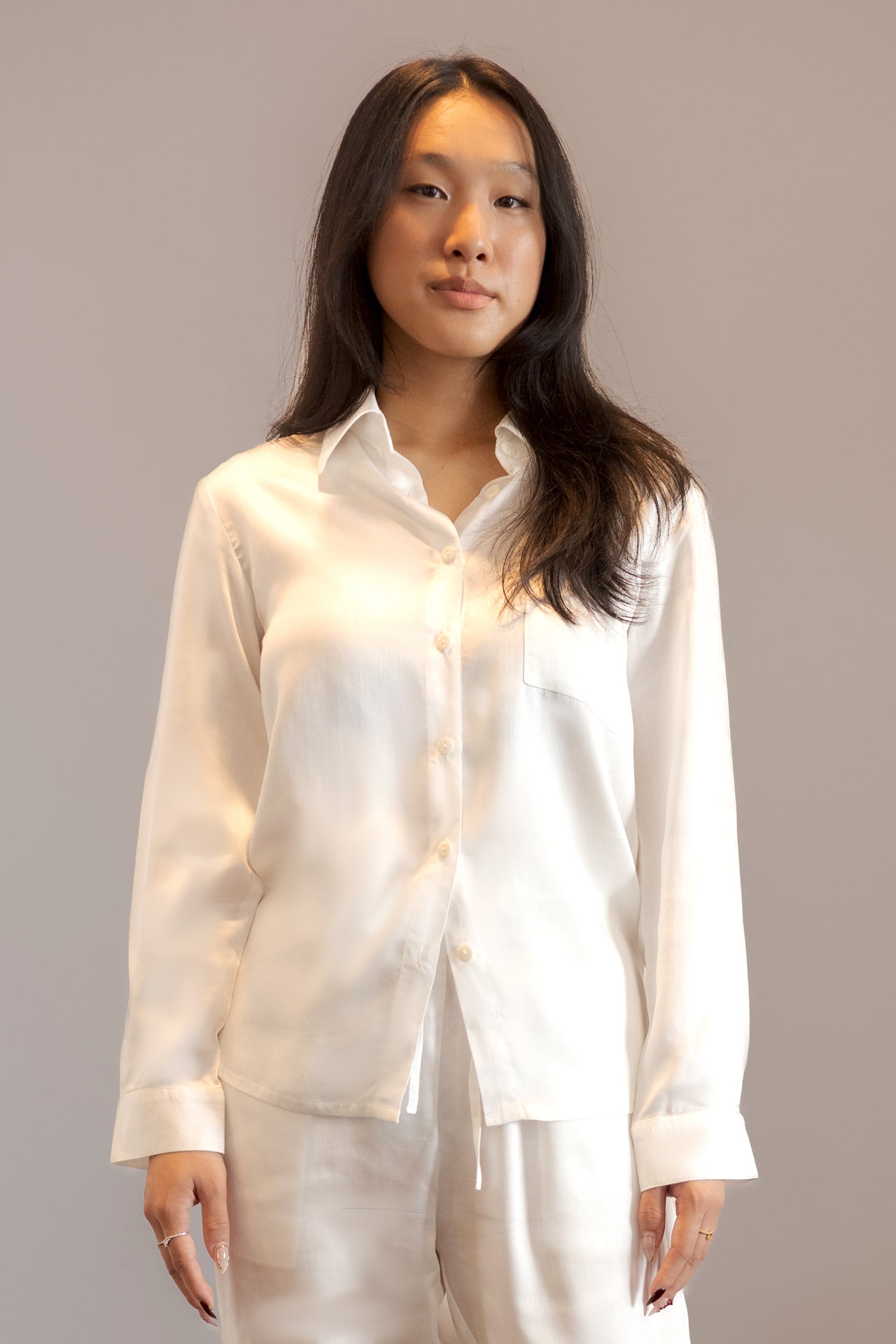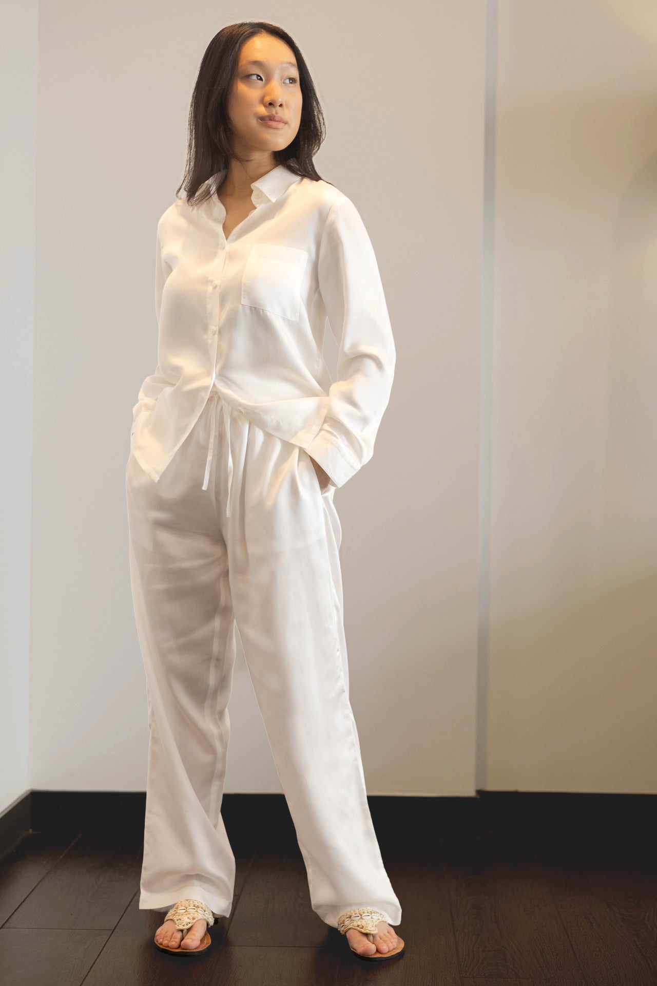 Upgrade your wardrobe with the luxurious Katia Shirt. Made from 100% Tencel, this classic button-down features a relaxed fit, tailored button-up cuffs, and a practical front pocket. Its silky-feel drapes comfortably against the skin, perfect for all-day wear. Pair with the matching Katia Pants for a seamless transition from casual to polished. A timeless silhouette for any season, exuding glamour and sophistication.